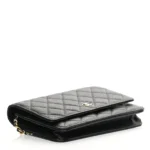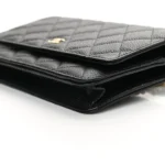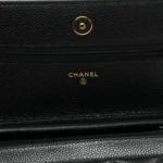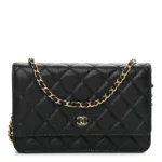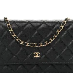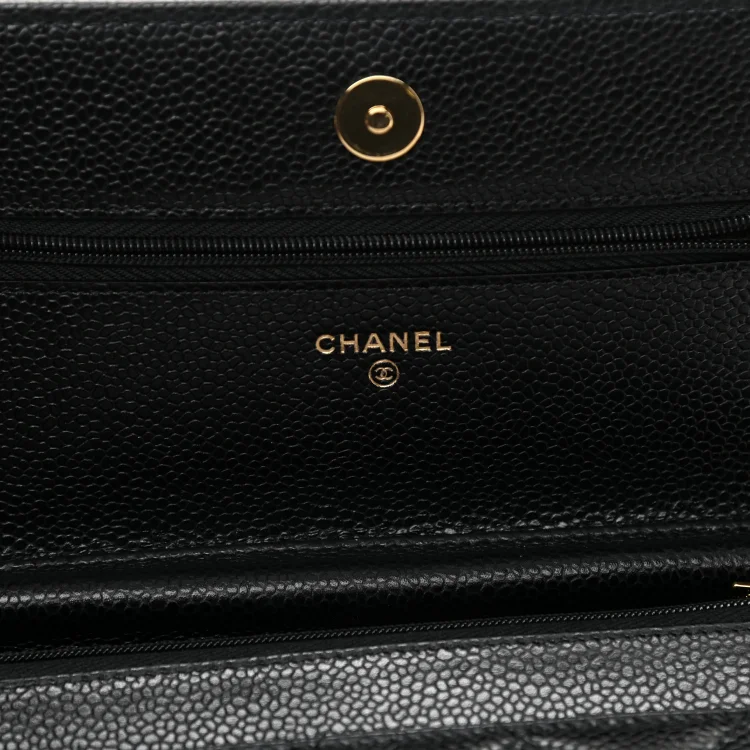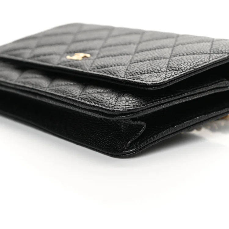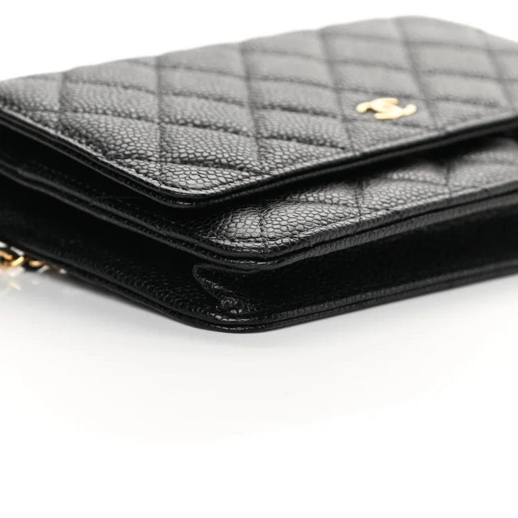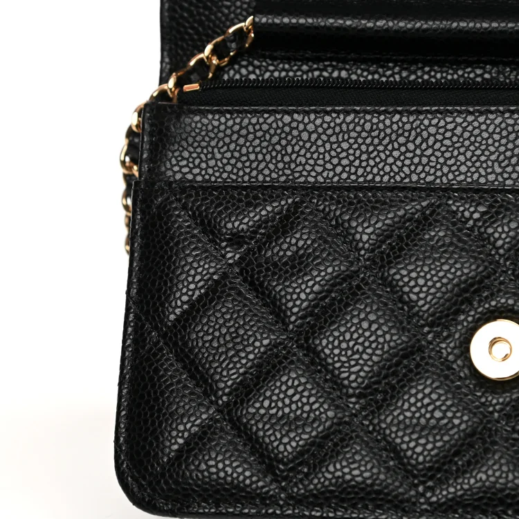 This is an authentic CC Caviar Quilted Wallet On Chain WOC in Black. This stylish shoulder bag is crafted of diamond quilted caviar calfskin leather in black. It features a leather threaded polished gold chain shoulder strap and a textured gold CC logo. The front flap opens to a burgundy fabric and leather interior with card slots. pockets. and a zipper compartment.