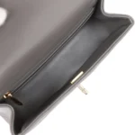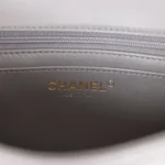 This Mini Rectangular flap bag is indarkgrey lambskin withlight gold tone hardware and has a front flap with signature CC turnlock closure. rear half moon pocket. top handle and single interwovendarkgreyleather andlight gold tone chain link shoulder/crossbody strap.