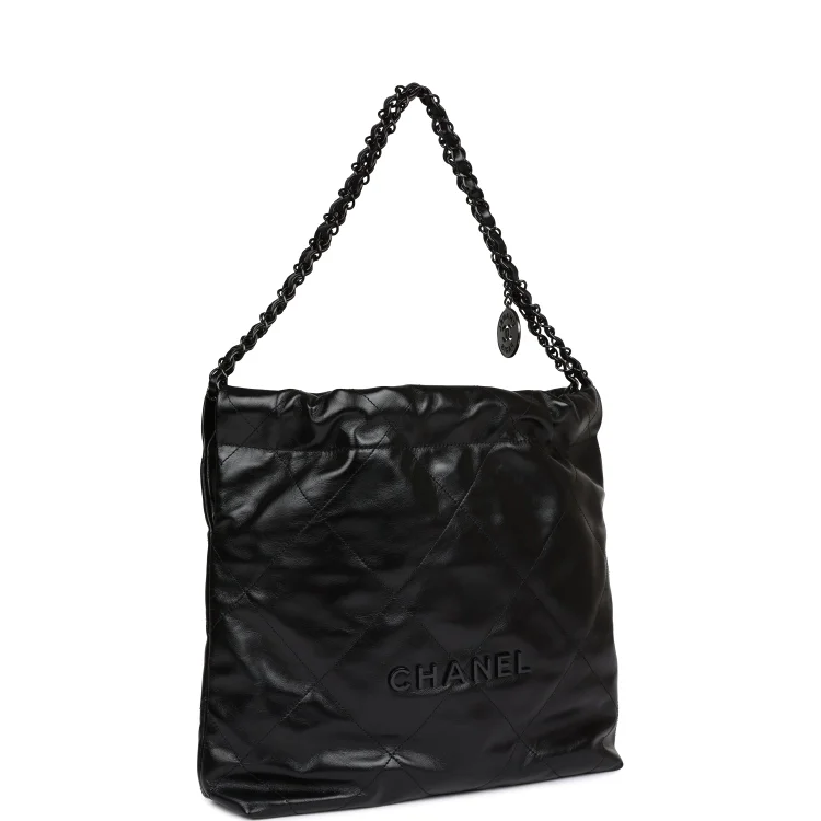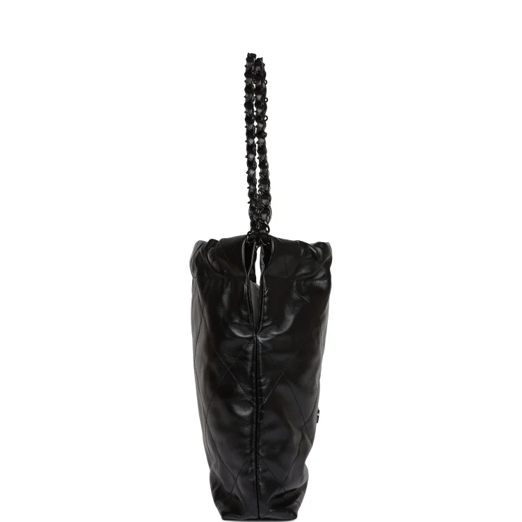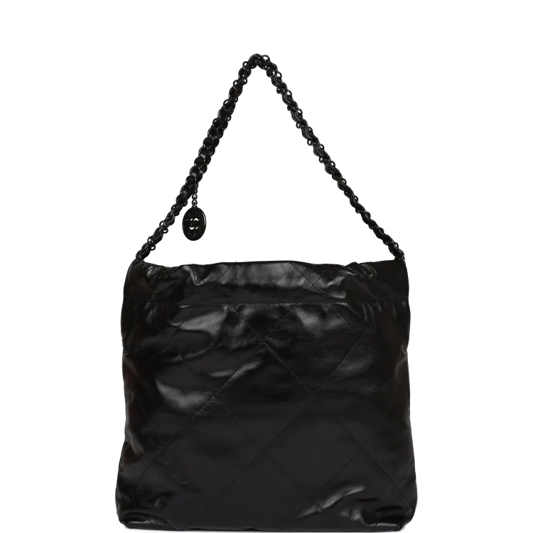 ThisSmall 22hobo bag is of SO blackcalfskin withblack hardware and has the signature diamond quilting. CC on the front inblack metal. removable pouch. and longblack metal andblack leather chain.