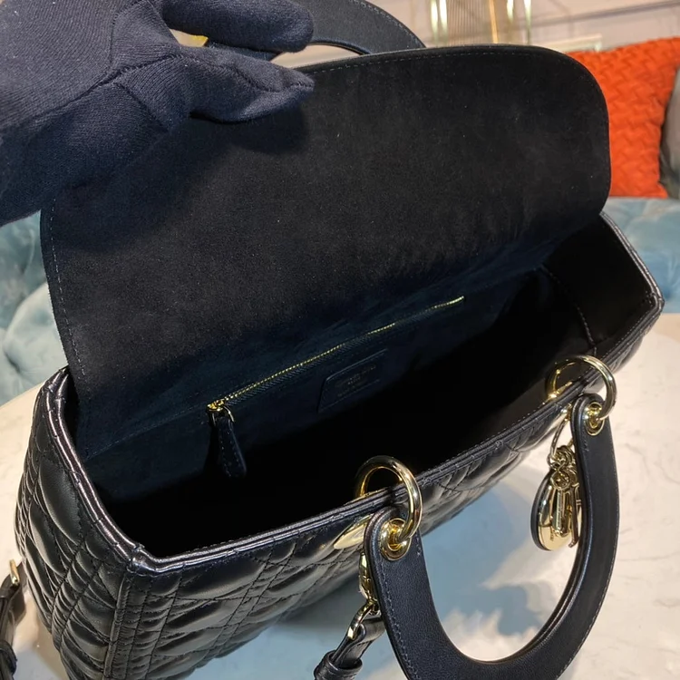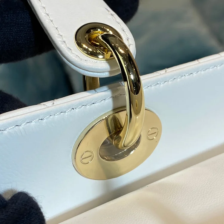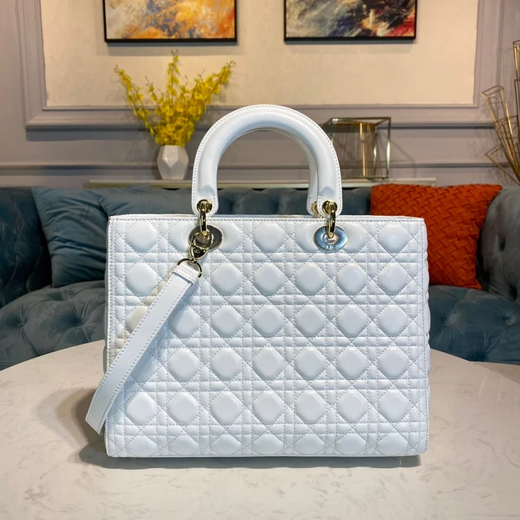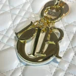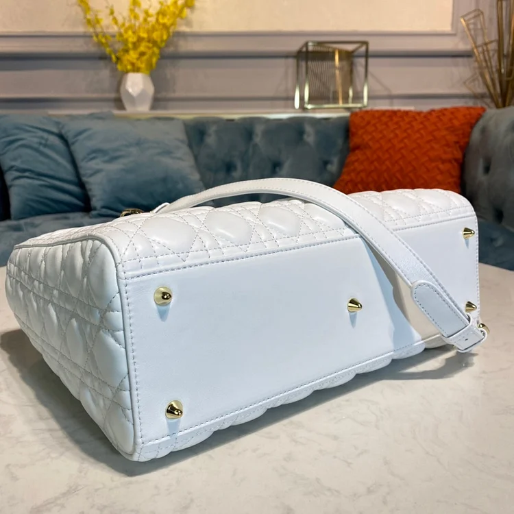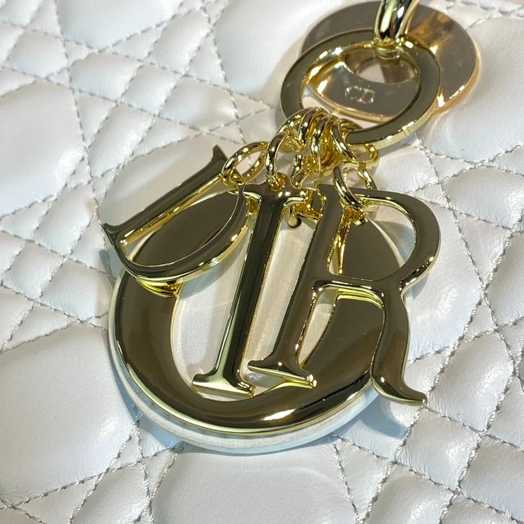 The Lady CD handbag epitomizes the House’s vision of elegance and beauty. Sleek and refined. the timeless yet relevant style is crafted in white ultramatte calfskin with Cannage stitching. creating the instantly recognizable quilted texture. The tonal metal ‘D.I.O.R.’ charms offer an elegant allure. Featuring a thin. removable leather shoulder strap. the large Lady CD bag can be carried by hand. worn over the shoulder or crossbody.