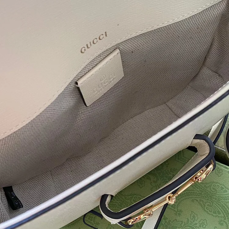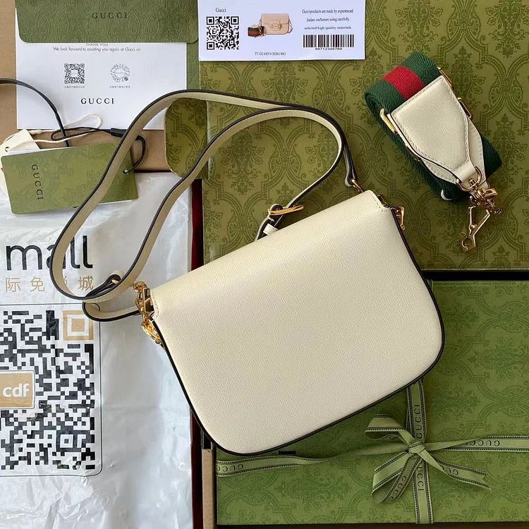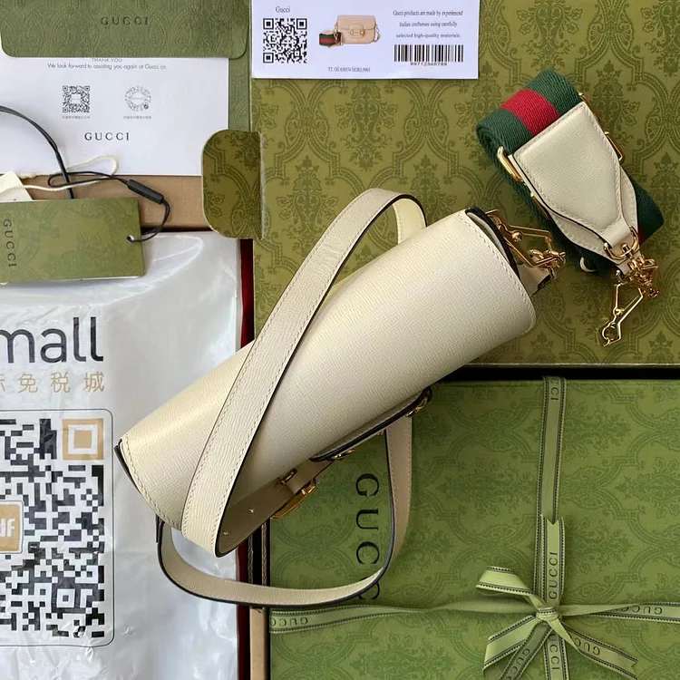Petite versions of the Gc Horsebit 1955 add a hybrid twist to the vintage inspired line. Enriched with two different shoulder straps. the white leather mini bag’s character transforms from understated elegance with a tonal leather strap to a strong logo feel thanks to a red and green Web option.