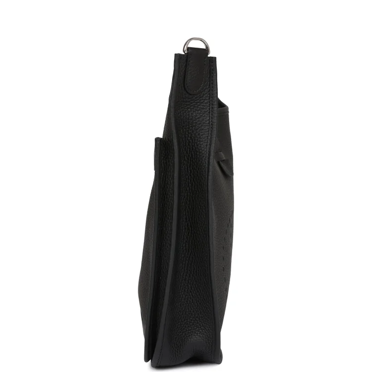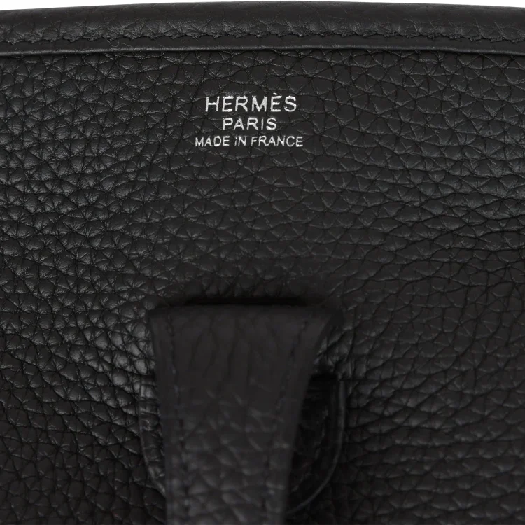 This Evelyne is inBlack clemence leather withpalladium hardware and has tonal stitching. pull tab top closure andBlack removable canvas and leather shoulder/crossbody strap.