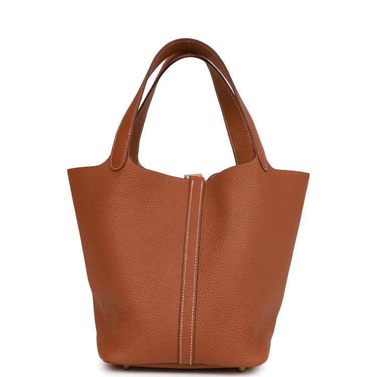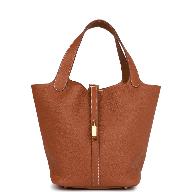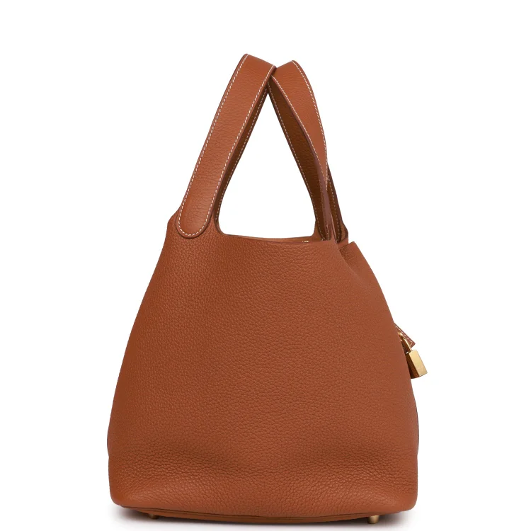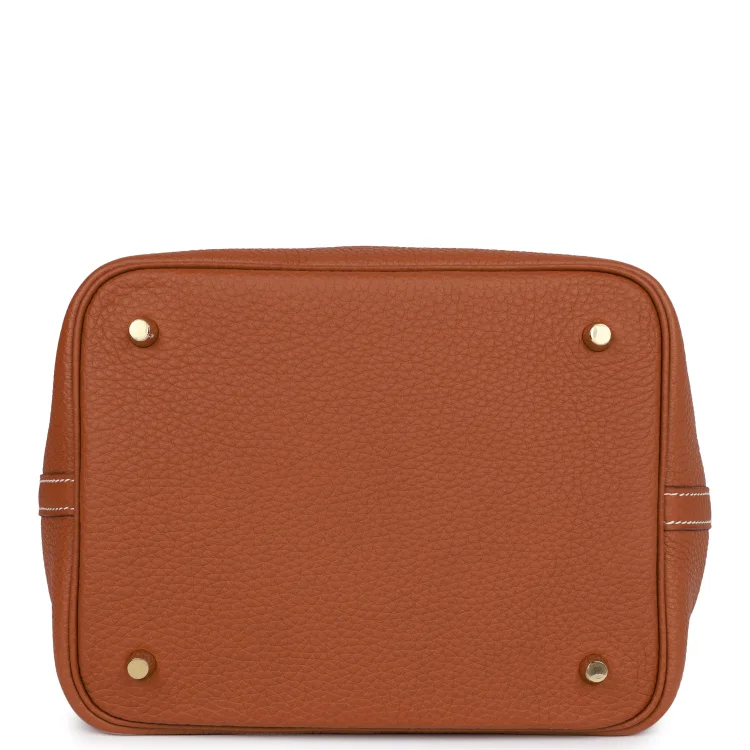 This Picotin is inGold clemence leather withgold hardware and hascontrast stitching with two top handles.