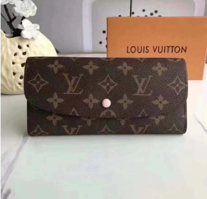 Stylish and practical. L’s classic Emilie Wallet is given a delicate. feminine feel by pink leather trim and a cute Monogram flower press stud and charm.