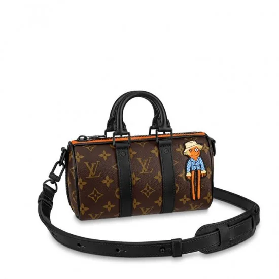 A compact version of the House’s original soft travel bag from 1930. the Keepall XS bag for men pairs Monogram canvas with black matte leather. The classic L look is enlivened with a touch of florescent orange along the zipper and an embroidered patch of a cartoon friend from Virgil Abloh’s ‘Zoom with friends’ animated film.