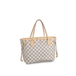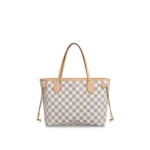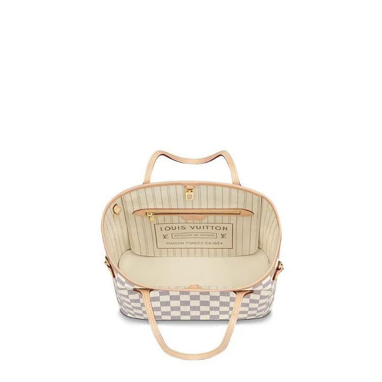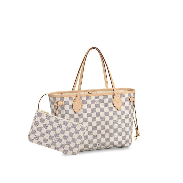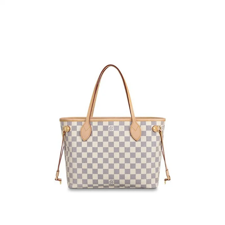 The Neverfull PM tote pairs timeless design with heritage details. Crafted from Damier Azur canvas with natural cowhide trim. it is capacious yet not bulky. with side laces that cinch for a sleek allure or loosen for a casual look. Slim. comfortable handles slip easily over the shoulder or arm. Lined in colorful textile. it features a removable pouch which can be used as a clutch or an extra pocket.