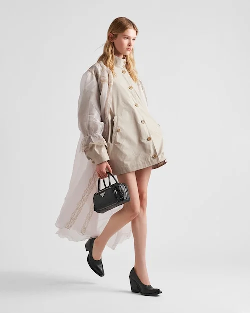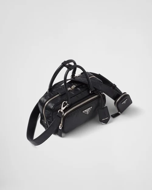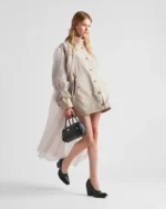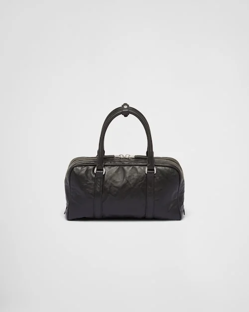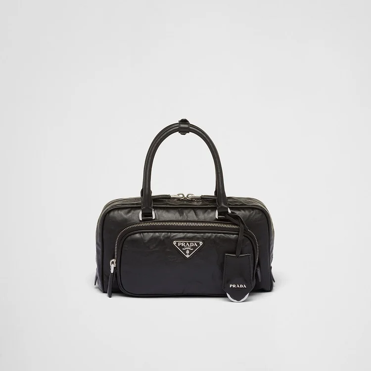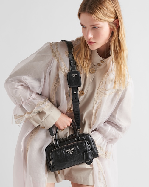 This bag with casual. classic allure is made of glossy nappa leather with a natural finish. A handmade wrinkled effect contrasts with the constructed and rigid concept. reinterpreting an everyday object to be worn without constraints. Presented in the Spring Summer 2023 collection. the style that is a re-edition of an accessory presented in 2001 is enhanced by the enameled metal triangle logo.
