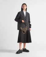 Characterized by a silhouette that recalls Prada’s iconic geometric shape. this mini-bag features the enameled metal triangle logo on the front that creates a refined contrast of different textures.
