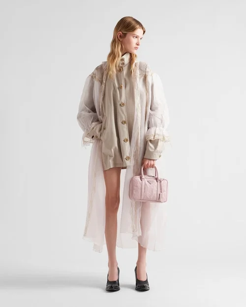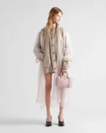 This bag with casual. classic allure is made of glossy nappa leather with a natural finish. The handmade wrinkled effect contrasts with the concept of a rigid construction. reinterpreting an everyday object that can be worn without constraints. Presented for the Spring Summer 2023 collection. the accessory that is a re-edition of a bag presented in 2001 is decorated with the enameled metal triangle logo.